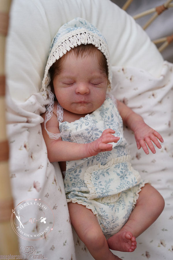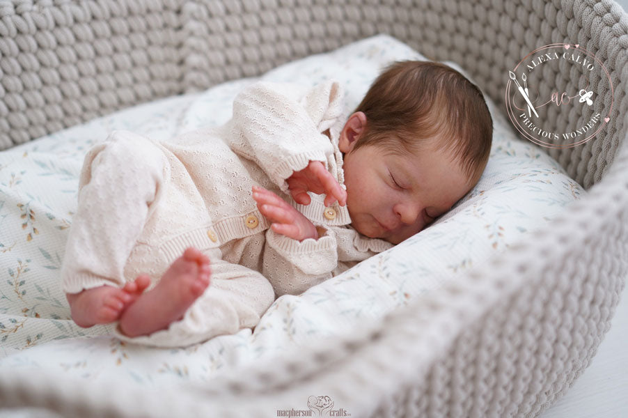 I will treat this sculpt like a ready made baby and create using my full artistic freedom. Babies will have my signature combi hair, painted and textured with mono rooting through the crown.  They will have individual differences based on their age and painting, to reflect the height of realism. This means baby may have peeling skin on their ankles or wrists, a lip blister, sleep in the eyes, milia, and birth details like heel prick or a creamier skin tone if the baby is older and not so newborny.
