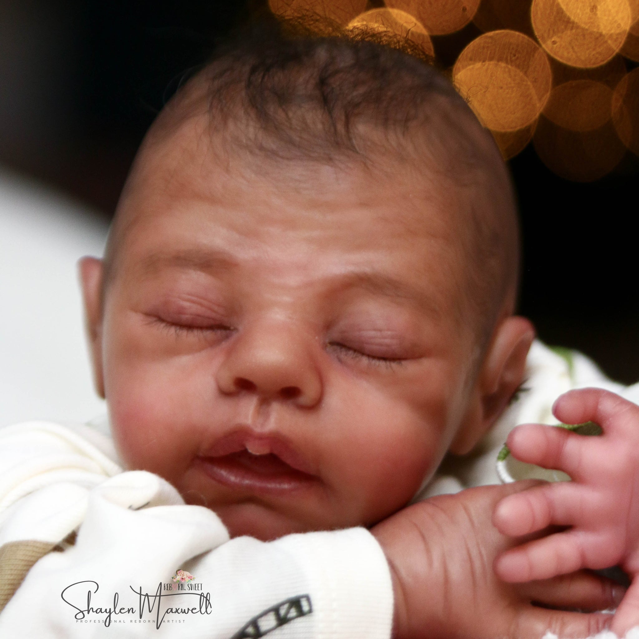 This baby boy is LE "Babsi" by Ulrike Gall. He is 17 1/2 inches with 3/4 arms and full legs on a non jointed body. He has a gorgeous biracial skin tone, with combi hair (painted and rooted throughout the crown). And rooted lashes. He was painted with Genesis Heat Set Paints and IRHSP and sealed and textured with many incredible 3D skin effects, IRHSP mediums.