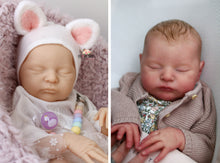 I will treat this sculpt like a ready made baby and create using my full artistic freedom. Babies will have my signature combi hair, painted and textured with mono rooting through the crown. They will have individual differences based on their age and painting, to reflect the height of realism. This means baby may have peeling skin on their ankles or wrists, a lip blister, sleep in the eyes, milia, and birth details like heel prick or a creamier skin tone if the baby is older and not so newborny.