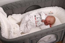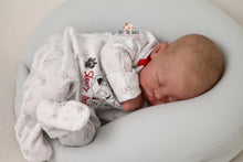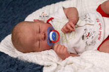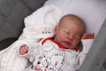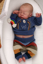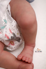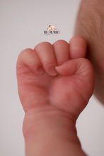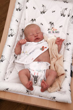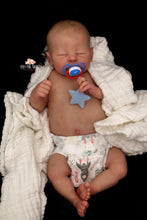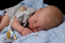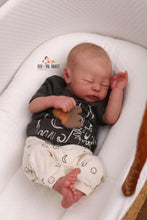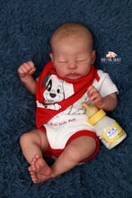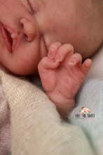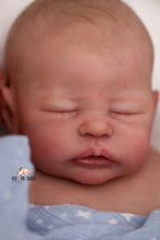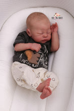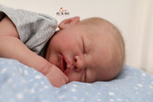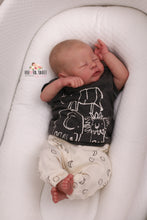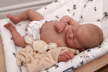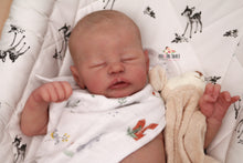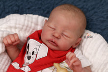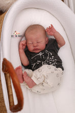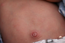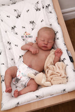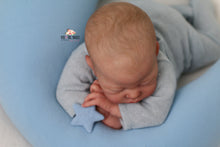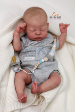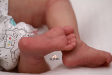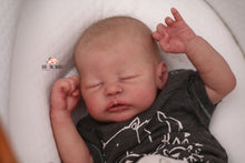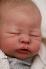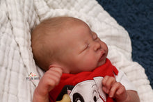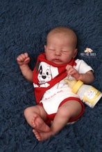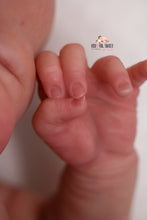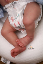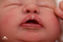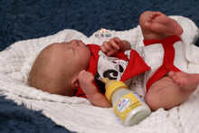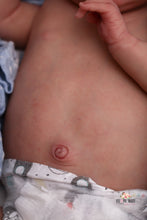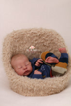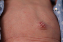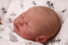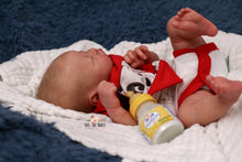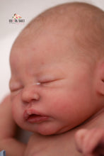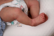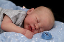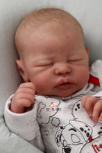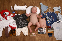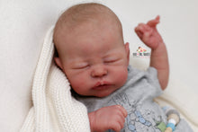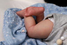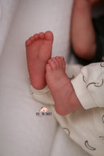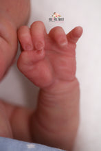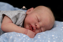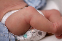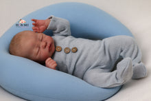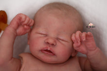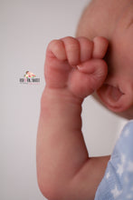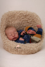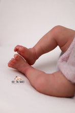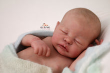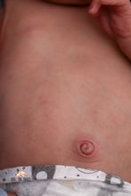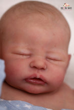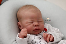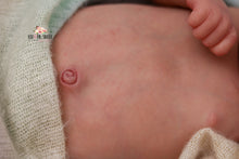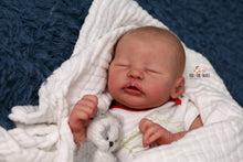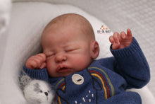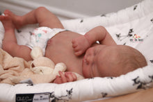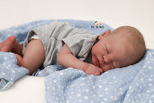 He has full arms, full legs, and is on a non-jointed body with the signature Quinlyn Belly Plate. He poses so realistically and is weighted to about 6lbs 4oz.